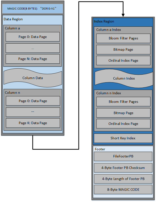 - Index Region: Doris stores the index data of each column in Index Region, where the data is loaded according to column granularity, so the data information of the following column is stored separately.