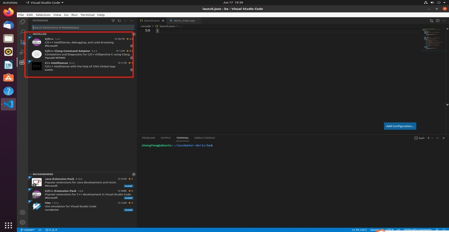 打开 vscode,并打开 be 源码所在目录,在本案例中打开目录为 /home/workspace/doris/