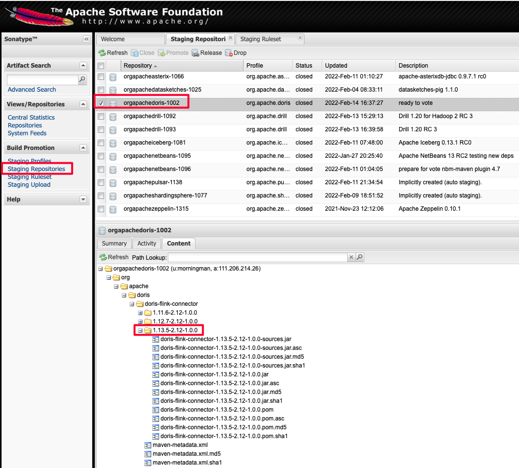 执行成功后,在 https://repository.apache.org/#stagingRepositories 里面可以找到刚刚发布的版本: