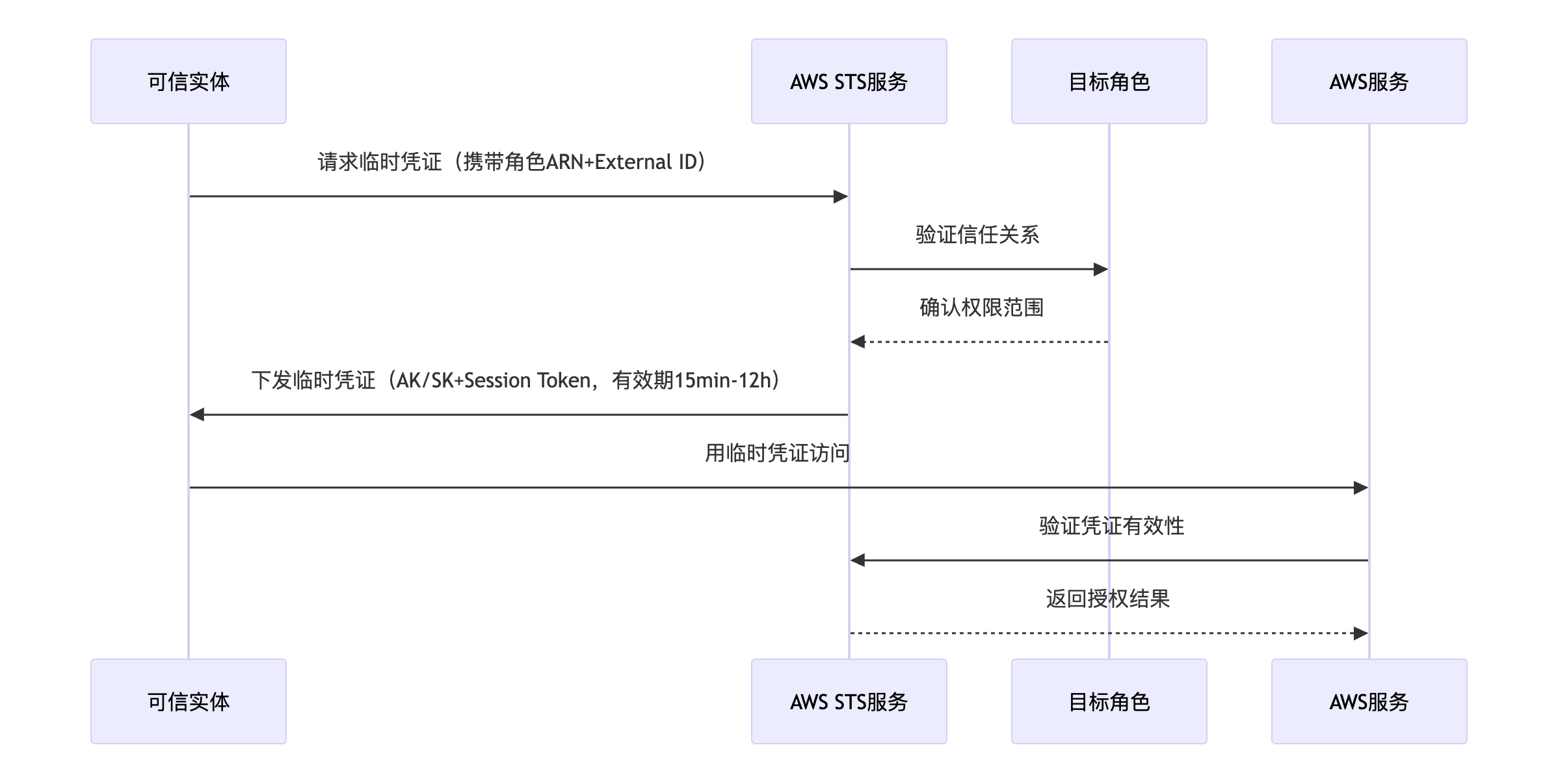 - 检查依据:目标角色绑定的IAM Trust Relationships Policies(明确允许哪些账号/用户担任该角色)