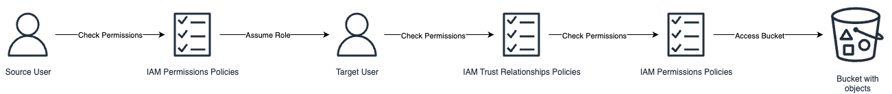 - 目标角色使用临时凭证访问S3前,目标账户的IAM策略引擎校验:该角色是否被授权执行请求的S3操作?(如s3:GetObject、s3:PutObject等)