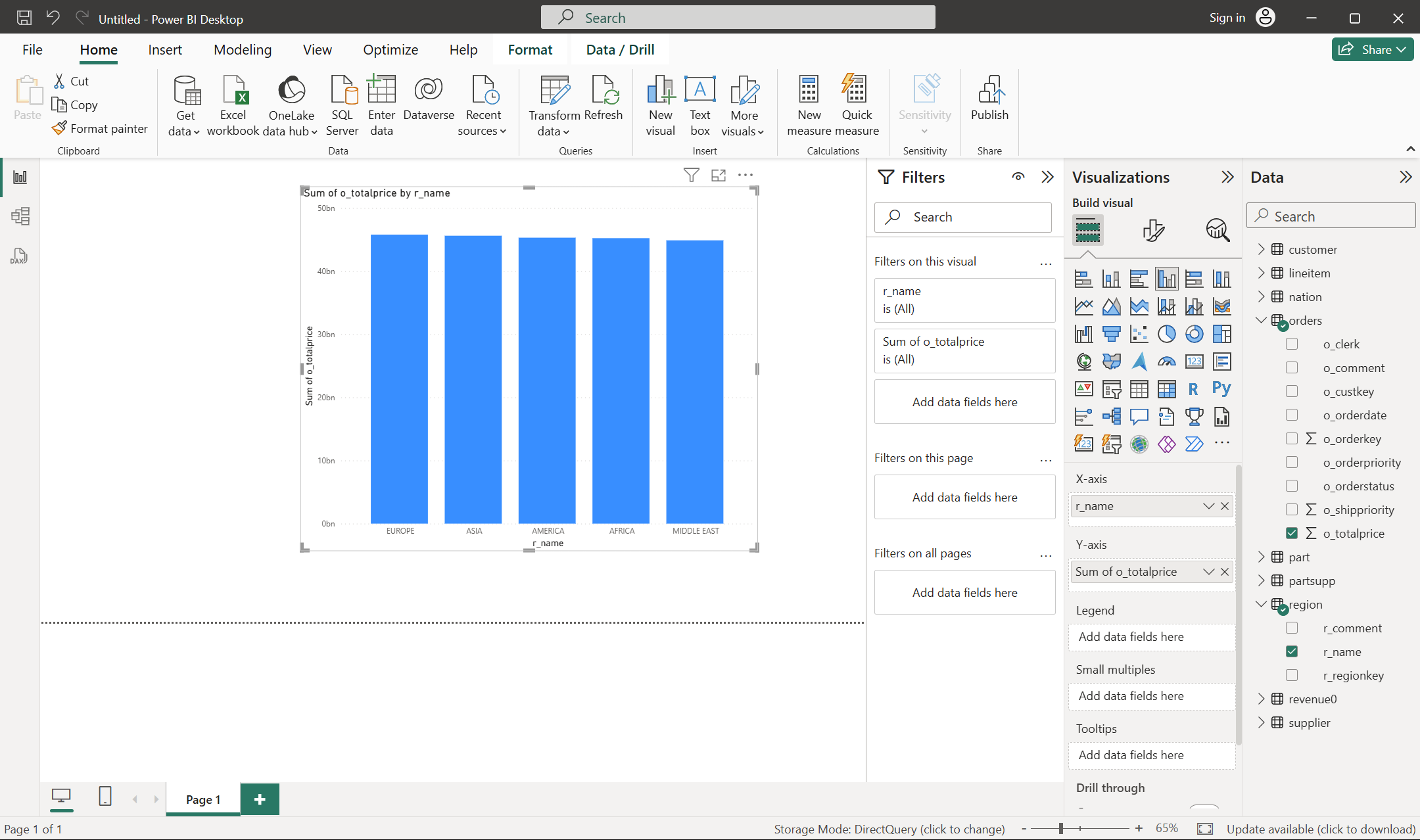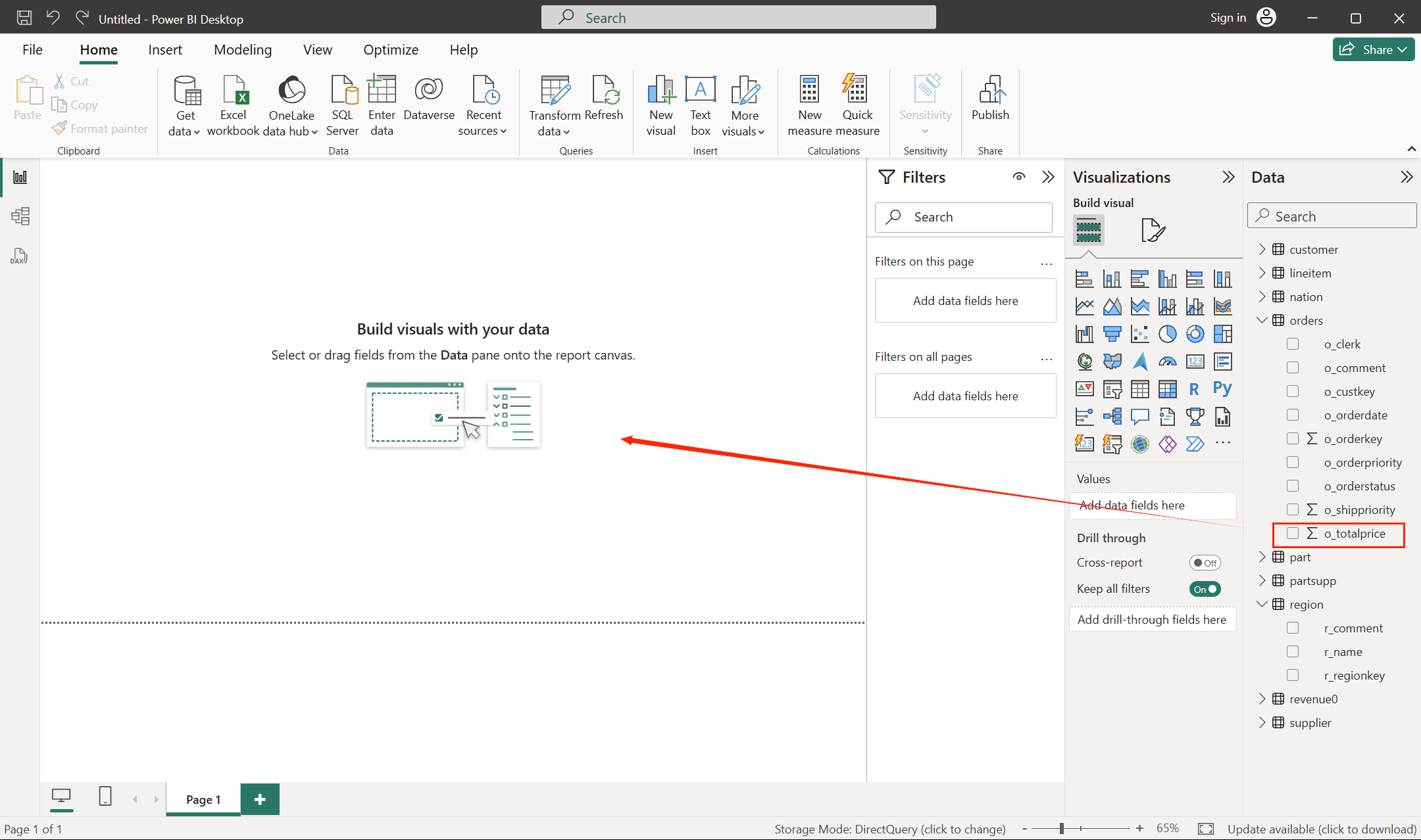 我们选择 TPC-H 数据作为数据源,Doris TPC-H 数据源构建方式参考此文档 现在我们在 Power BI 中配置了 Doris 数据源,让我们可视化数据...