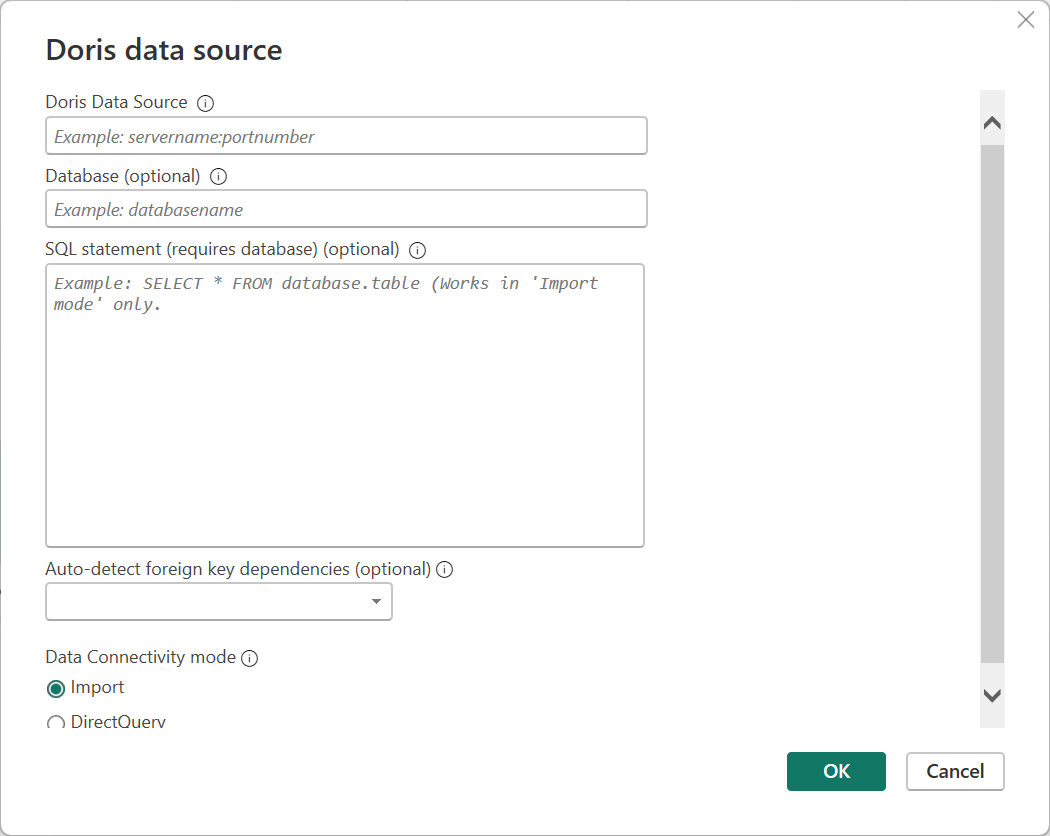 1. 假定 power_bi_path 为 windows 操作系统中 Power BI Desktop 的目录,一般默认为:power_bi_path = C:\Program Files\Power BI Desktop 参考此处路径 %power_bi_path%\Custom Connectors folder,放置 Doris.mez 自定义连接器文件(如果路径不存在,按需手动创建)。
