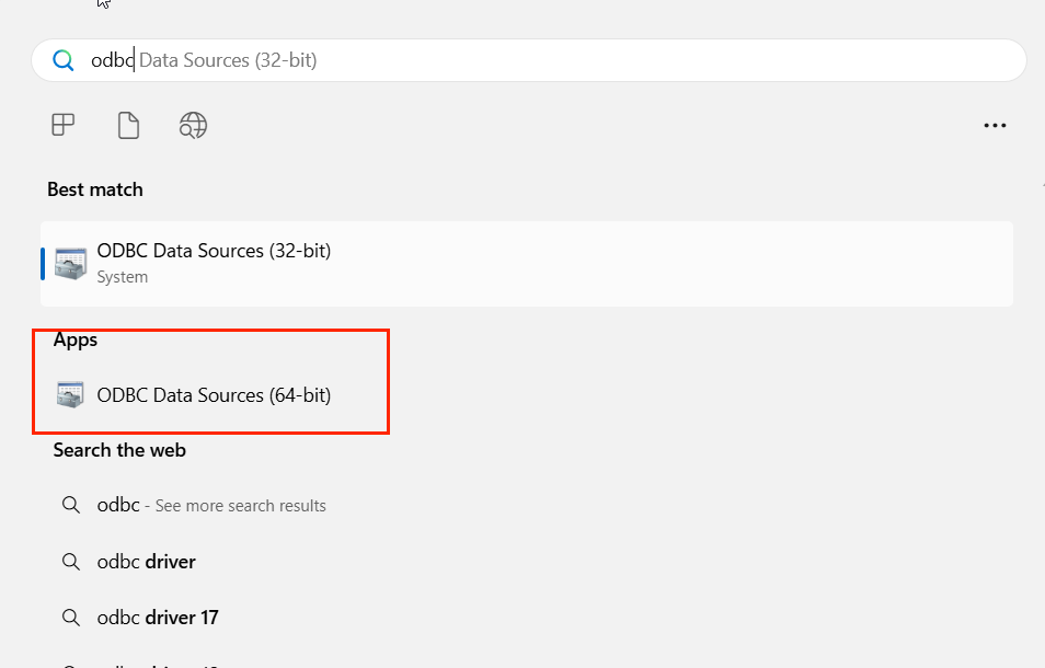 在开始菜单中输入 'ODBC' 并选择 "ODBC 数据源 (64 位)"。