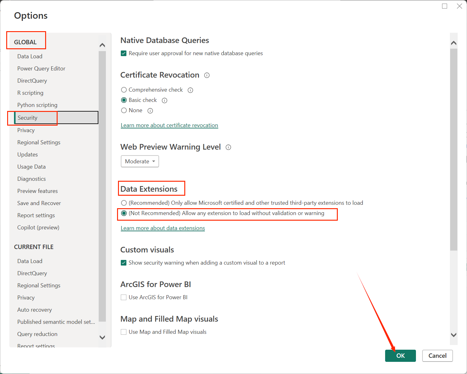2. 在 Power BI Desktop 中,选择 File > Options and settings > Options > Security,在 Data Extensions 下,勾选 (Not Recommended) Allow any extension to load without validation or warning 。可以屏蔽掉未认证连接器的限制。